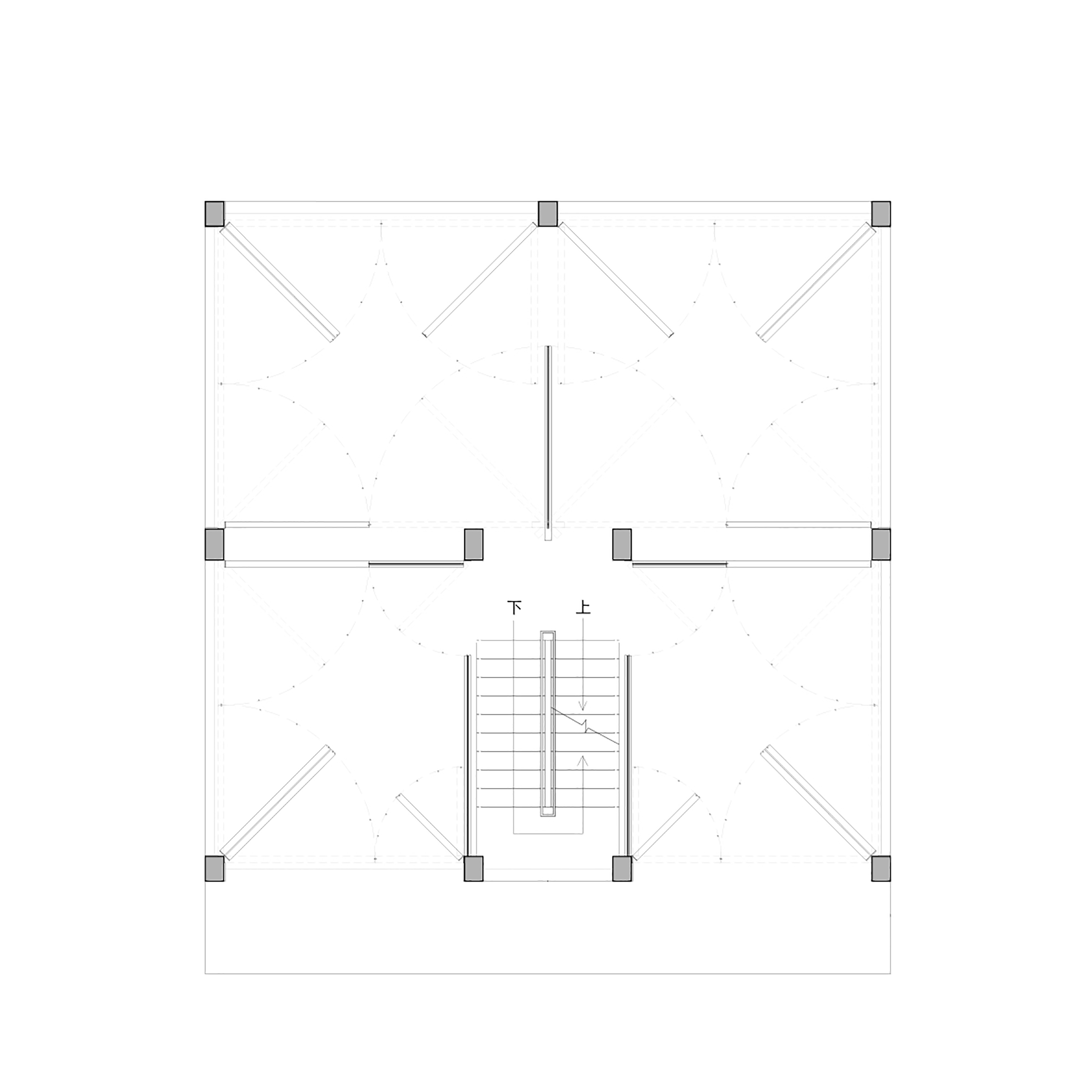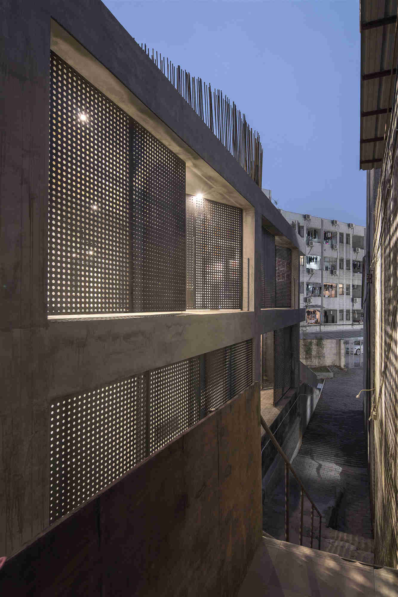 The closed doors are covered by the perforated patterns. In the daytime, the sun light will go through the holes and leave shadows on the ground. After sunset, the light coming through the holes will vaguely constitute the face of Corbusier, a serious gazing face, is superimposed with the modern industrial landscape that he expects to grow. Through the eyes of this architect, who construct the Western Architectural Theory, people can catch a sight of this village growing in the south of China.