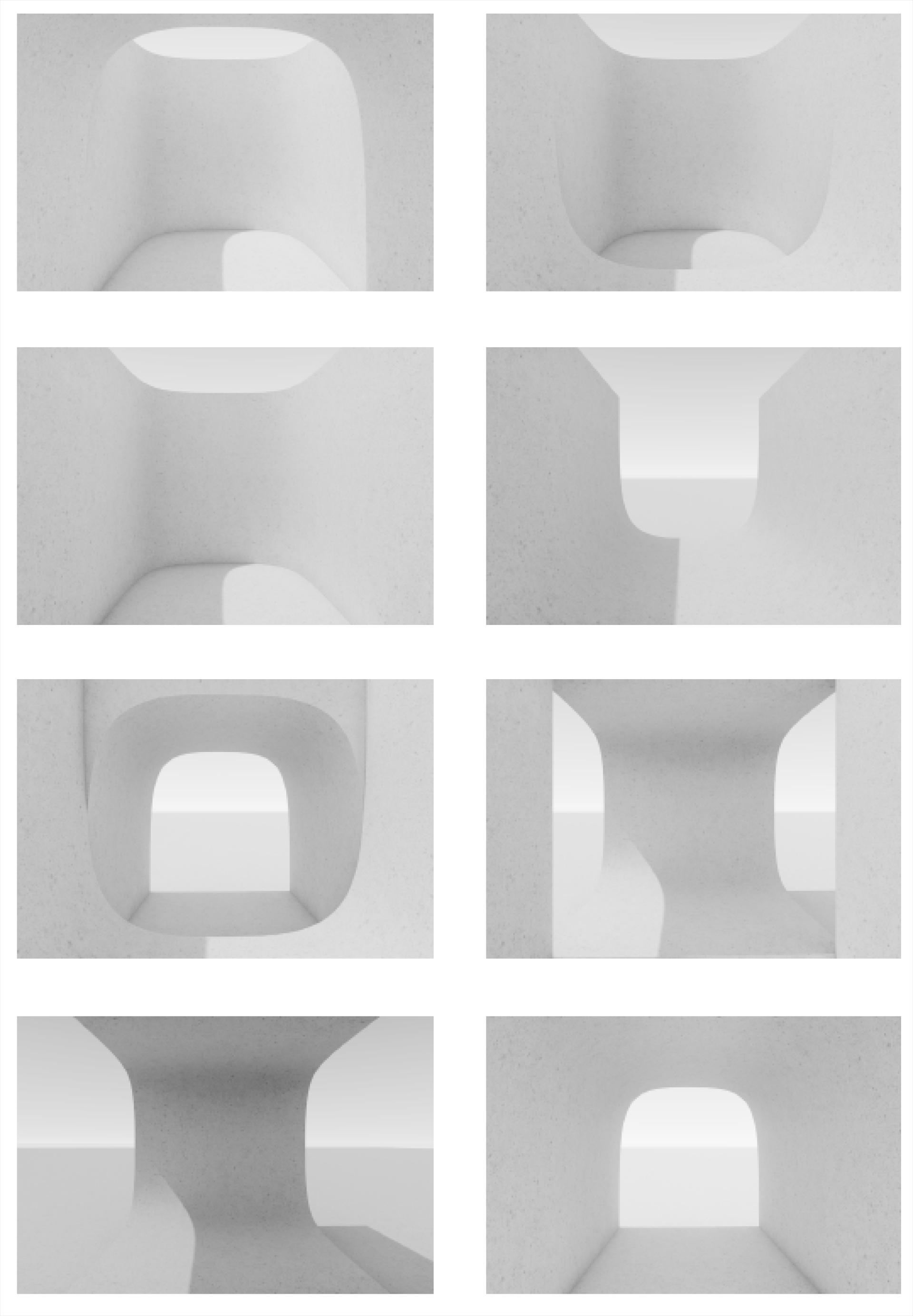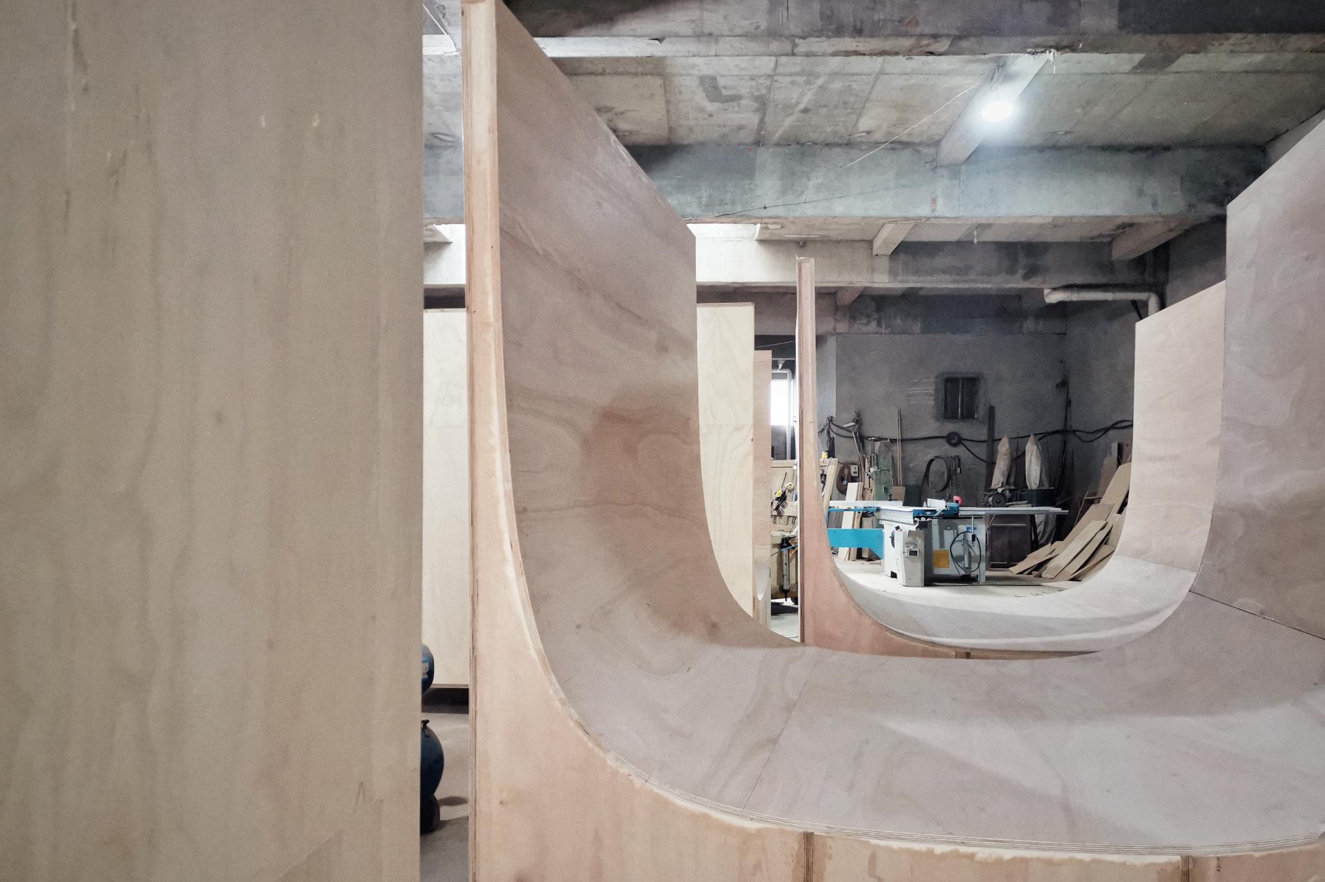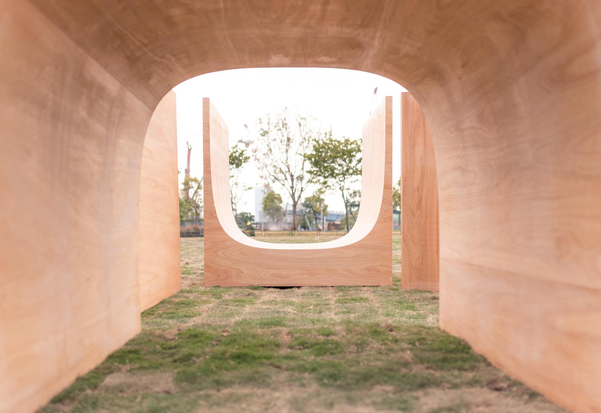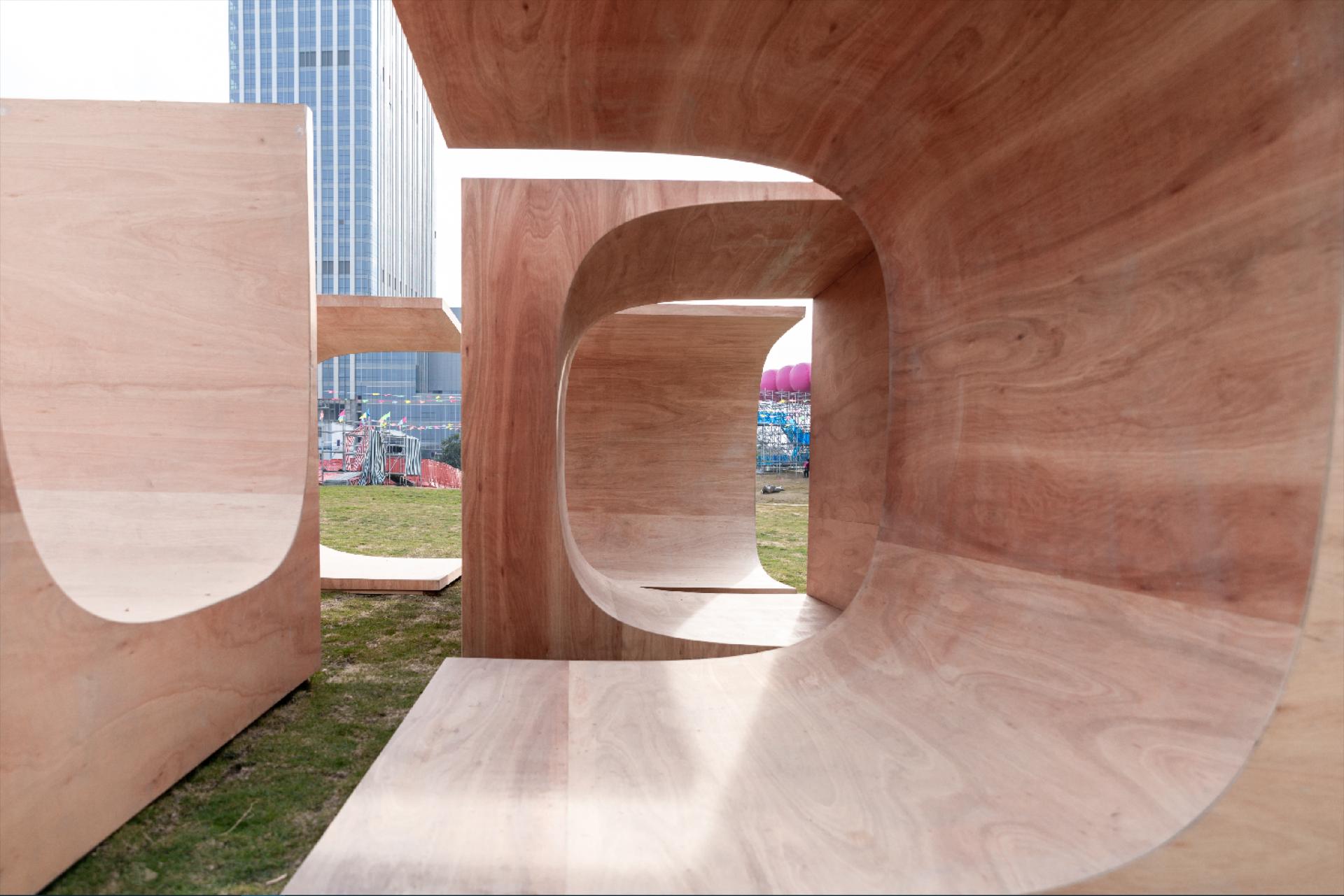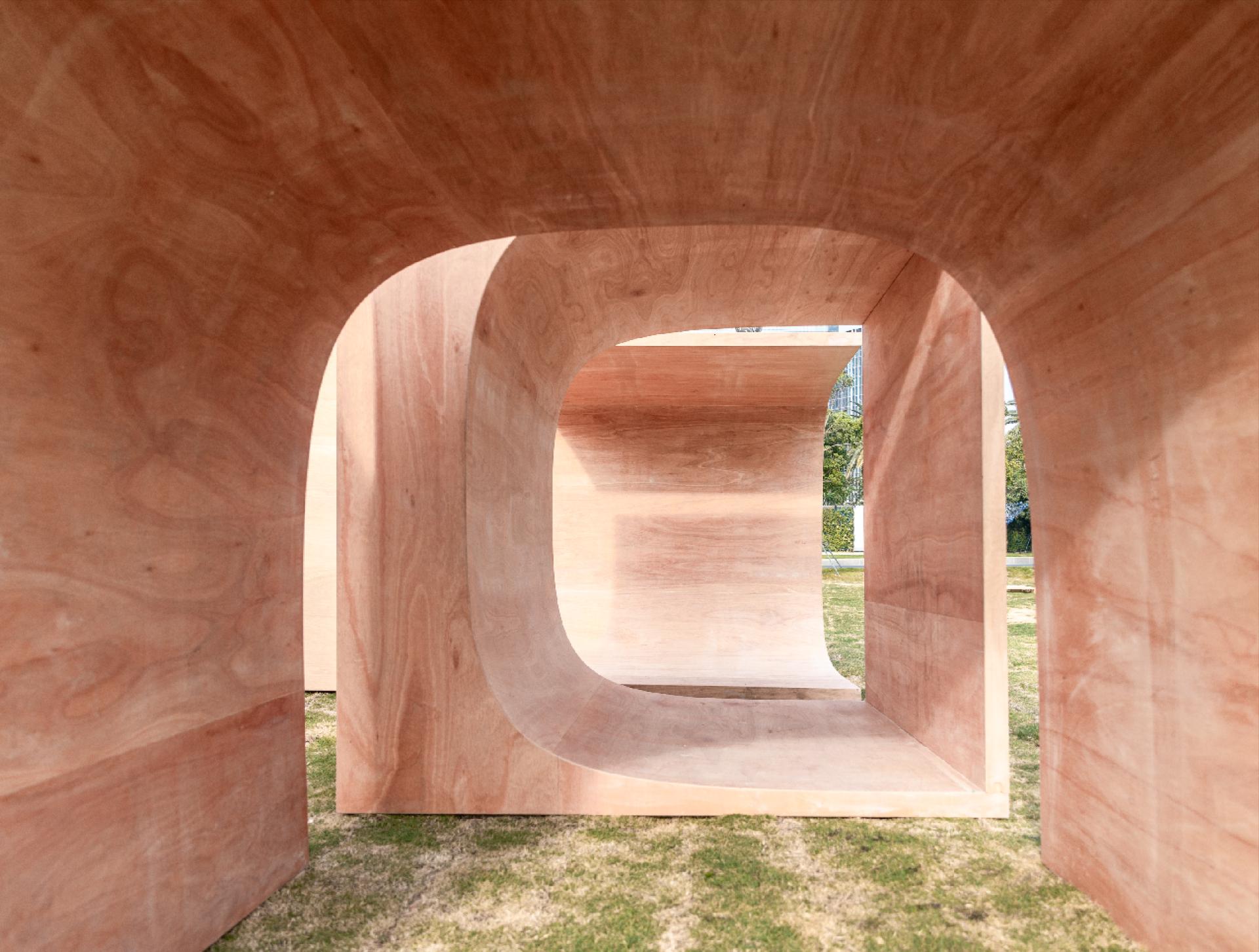 通过单元模块被“挖去”的曲面空间的多样化组合连接,产生阻挡、庇护、倚靠、诱导等空间感受。本次参展模块空间隐藏了一条回旋流线,使连贯的空间流动成为主导。