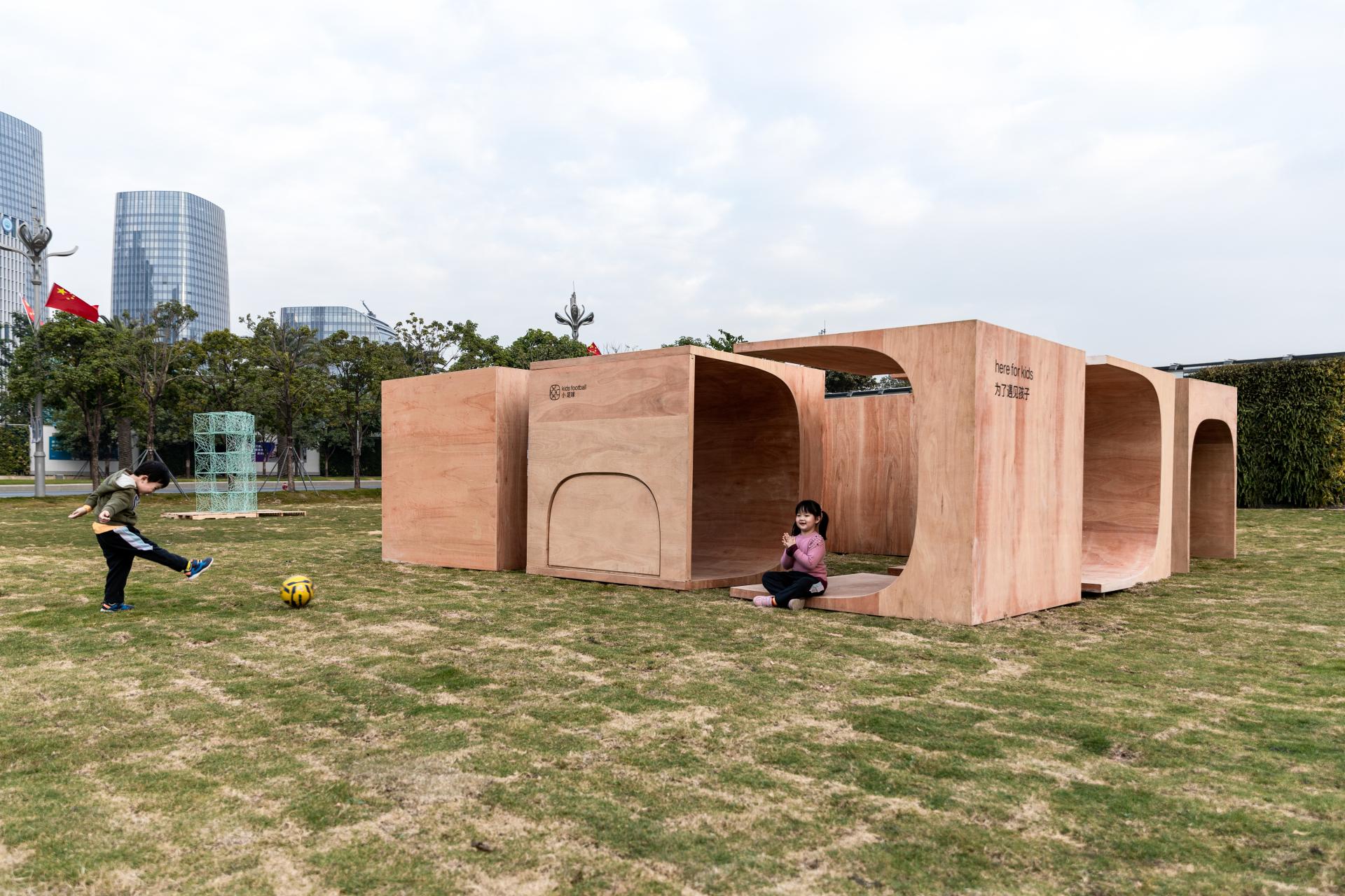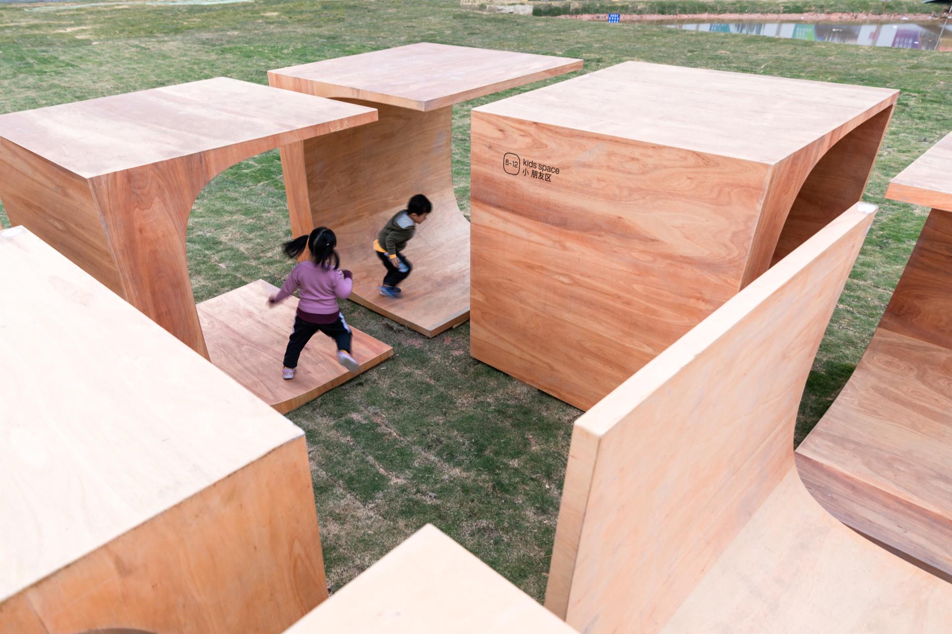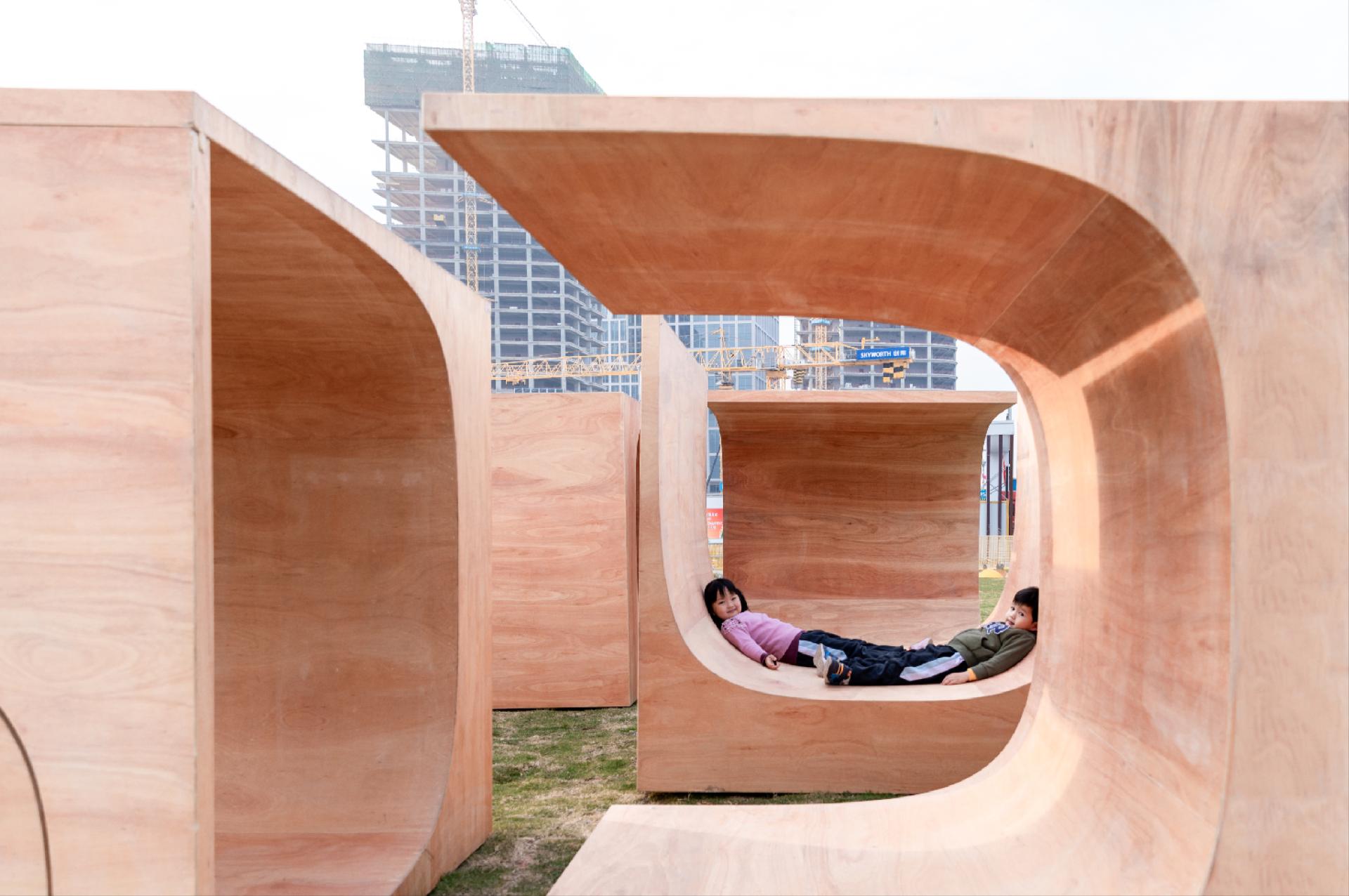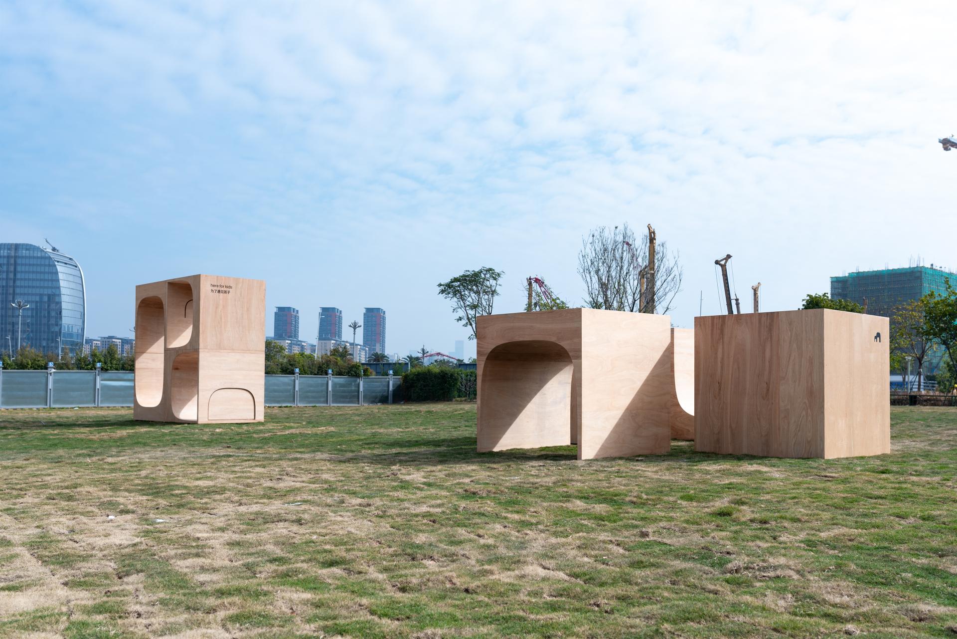 “运动积木”位于“2020前海未来城市/建筑展:瞬间城市板块”的一处绿草地上,由8个相同的木盒子,以不同的姿态滋生出一组空间游憩系统。“运动积木”顾名思义,指可提供少年儿童体育锻炼的组合式功能空间,同时也隐含了“动态的”模块概念。