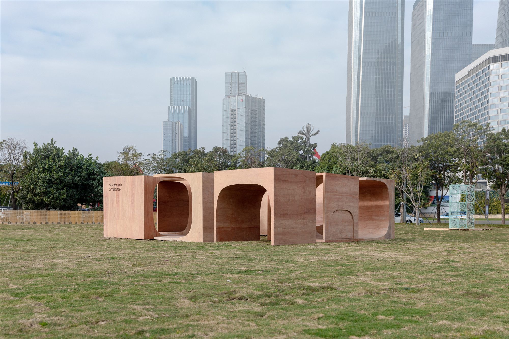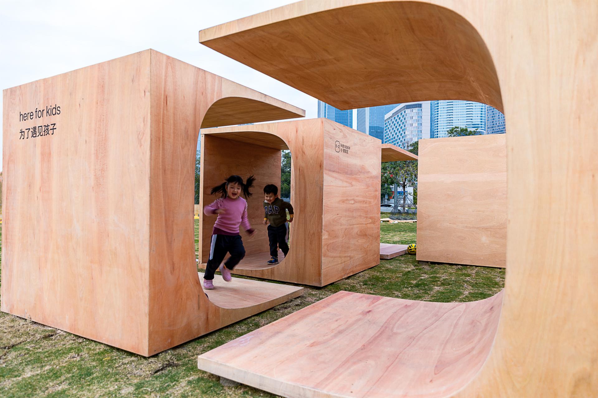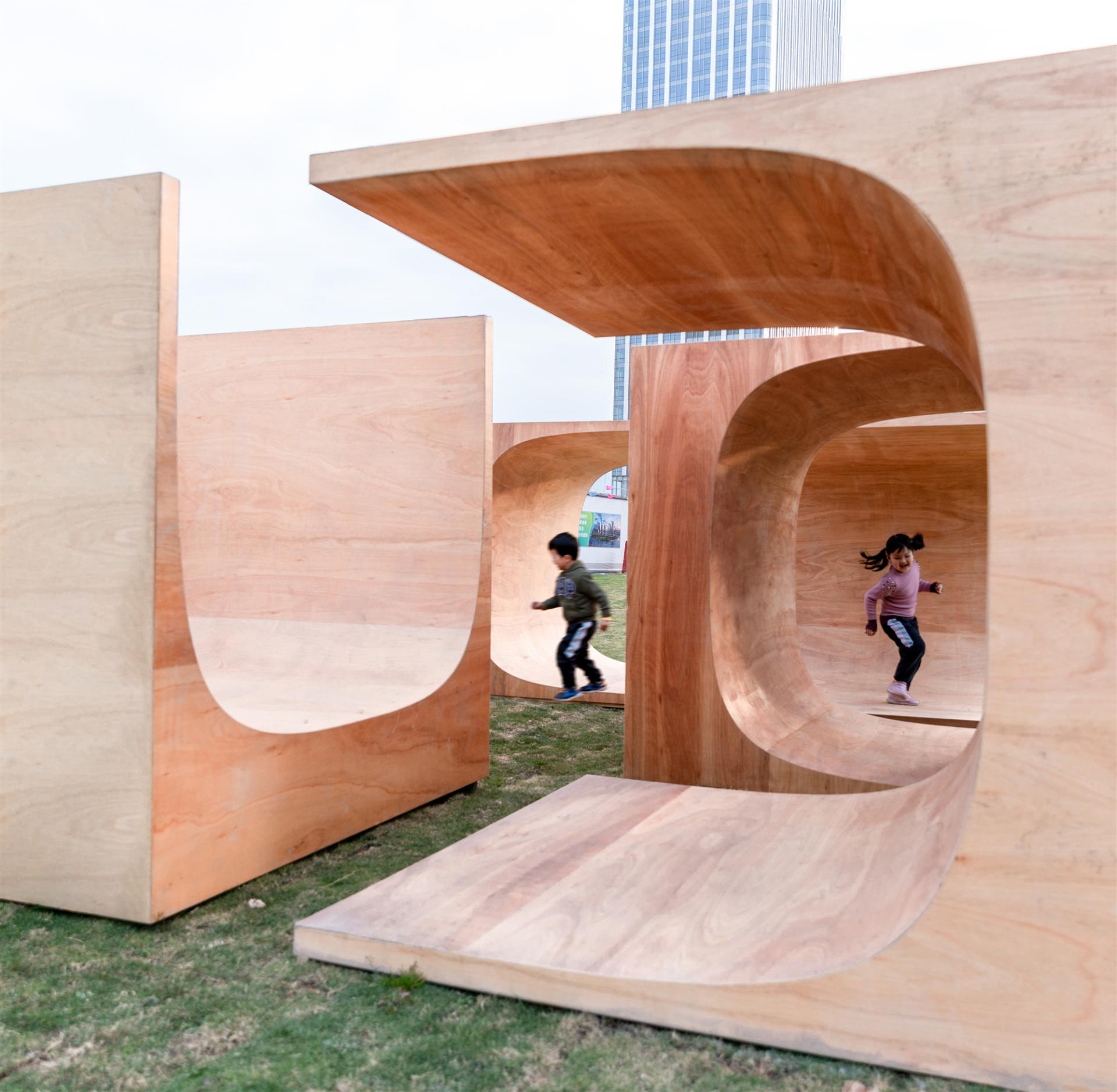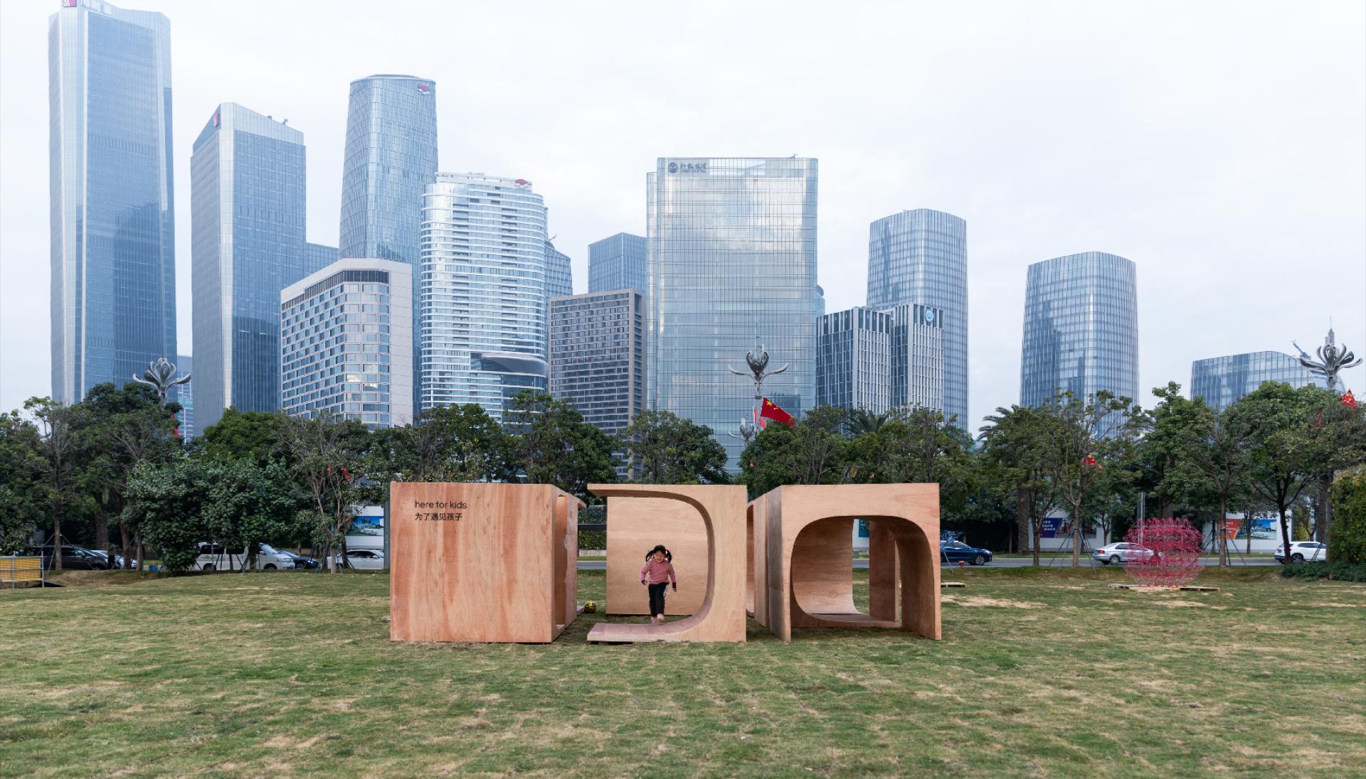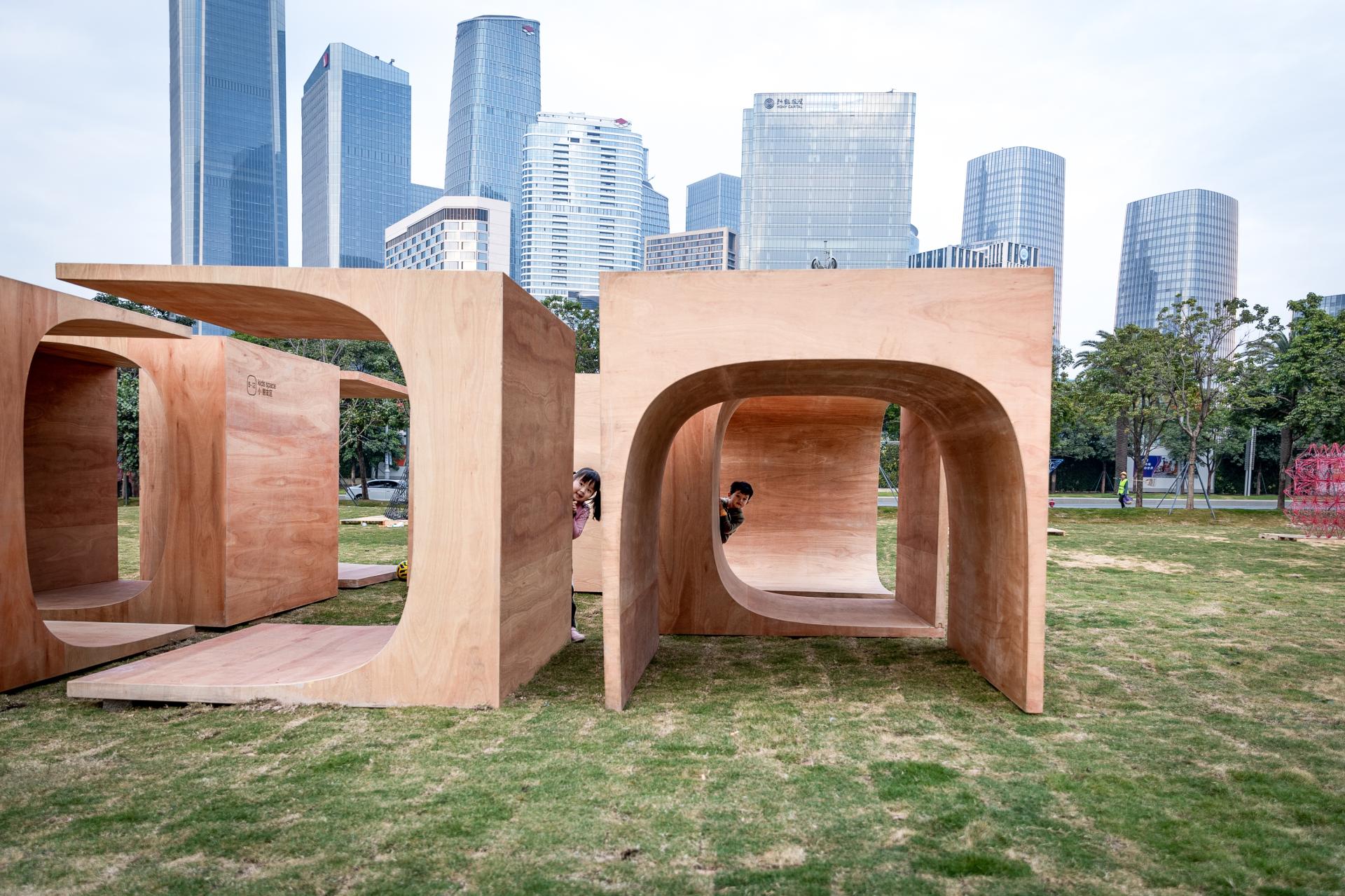“运动积木”位于“2020前海未来城市/建筑展:瞬间城市板块”的一处绿草地上,由8个相同的木盒子,以不同的姿态滋生出一组空间游憩系统。“运动积木”顾名思义,指可提供少年儿童体育锻炼的组合式功能空间,同时也隐含了“动态的”模块概念。