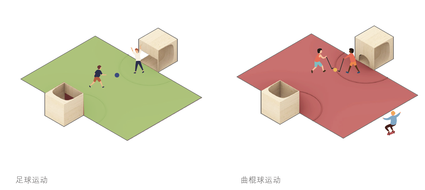 单元模块通过“即插即用”的功能墙面(简称插件墙)来丰富运动形式,如篮球、小足球、曲棍球等运动均可定制化呈现。可迭代更替的插件墙大大提高了模块的使用效率及功能拓展。