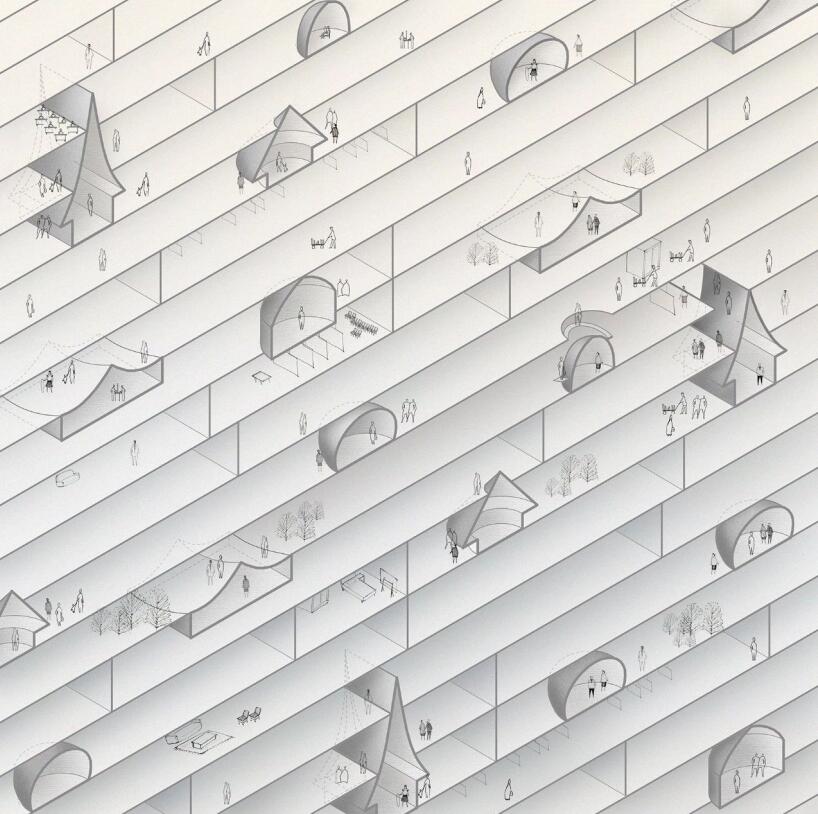 本原设计师将乡土建筑空间抽象提取置入现代高密度建筑中,提供回忆和精神,也创造交流和文化。
