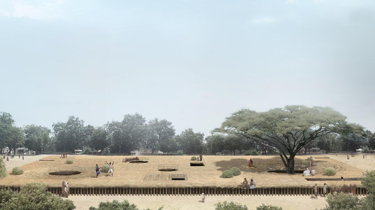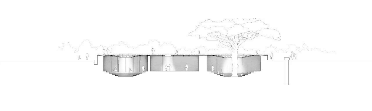 我们将文化中心主体建筑部分置于地下,将建筑的屋顶设计为一个开放公园,屋顶上的开口灵感来源于当地民居的雨水收集方式——雨水从屋顶收集进入地下室,最终储存在水箱中。地下空间创造了一种沉浸式的体验,不仅可以遮阳避暑,更保证了内部空间的隐私性。一棵独特的本地木棉树种植在开口的中心,穿过屋顶为屋顶公园的游客提供观赏效果和遮荫功能。
