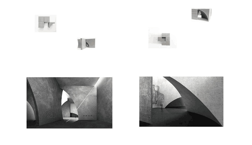 笔触不仅是书写运动的美学结果,也定义了二维书写的边缘和布局,即什么是内部(墨水部分),什么是外部(纸张部分)。设计师们将笔触作为“写”空间的工具,通过类似“空间笔触”的减法操作来建立博物馆空间,定义空间的“文字”形态。不同的笔触模块可以通过“加减”的思路与不同的功能联系起来,通过设计将笔触所包含的笔划移动(水平位移),落笔力度(垂直位移),以及落笔角度(方向)三个变量转化为球体与立方体的切割关系,最终完成体量雕切的操作。