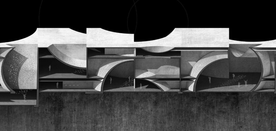 在平面设计中,笔触形体较突出的将作为主要展览空间,可作为庭院、采光井、下沉展厅、球幕展厅等公共空间;笔触模块形态较内敛的将布置为档案馆、办公室、储藏区、机电区等私密空间;还有些笔触模块带有明显斜坡或台阶特质的,可作为报告厅、阶梯式图书馆、小剧场等;一些具有特殊体量特色的笔触模块将布置在入口、博物馆大厅、餐厅及纪念品商店等位置。所有的模块像细胞组织一样相互紧密连接又各自具有独立性,富有特色的边界组合形成统一而丰富的建筑空间。
